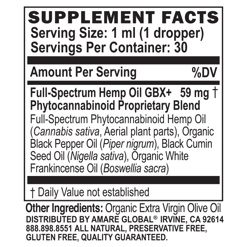 Amare’s HempGBX+ is a full-spectrum hemp extract that may naturally support the body’s endocannabinoid system, amplifying the benefits of an optimized gut-brain axis. Specifically formulated to synergistically complement Amare’s robust lineup of all-natural mental wellness products, HempGBX+ may amplify mental wellness benefits such as positive mood, stress resilience, sleep quality, relief from aches and pains, and more.*